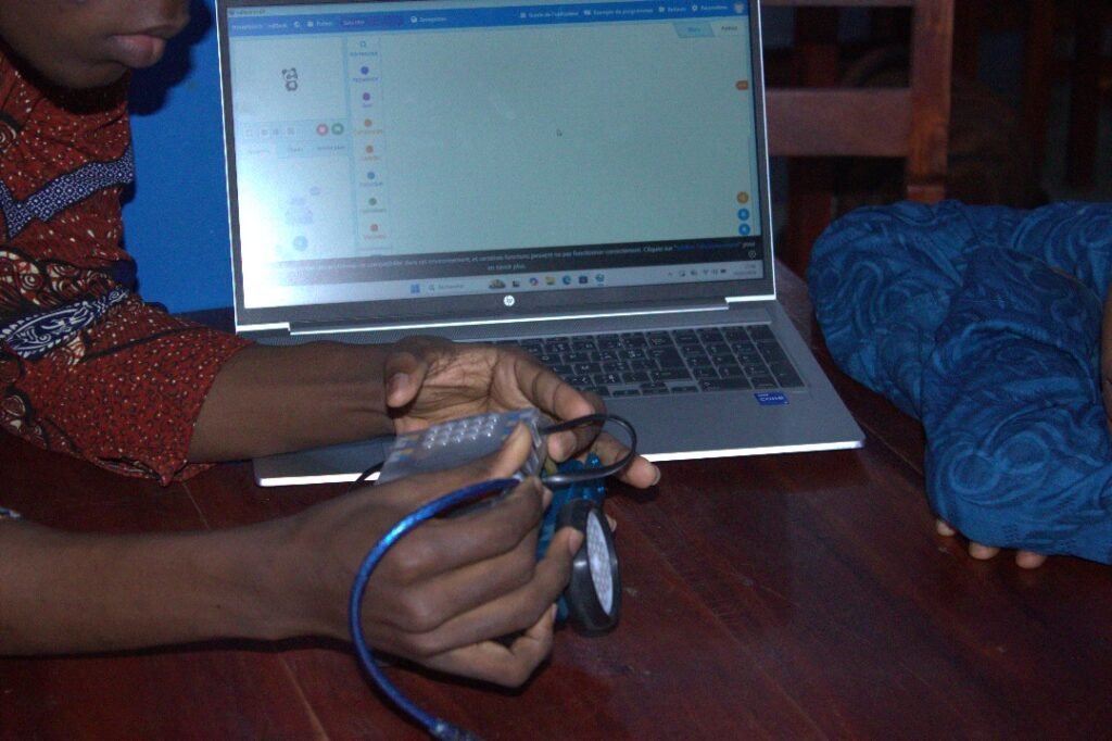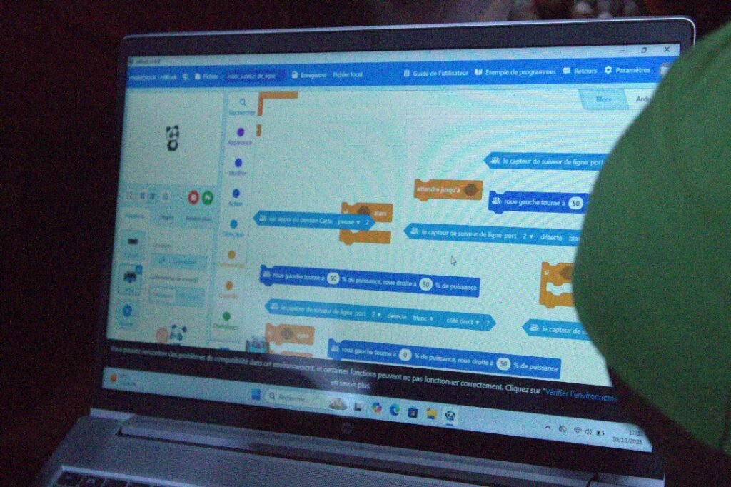 Cette première phase a été suivie d’une initiation à la robotique mobile à travers l’utilisation du robot mBot. En programmant ses déplacements et ses réactions, les jeunes ont découvert de manière concrète le lien entre le code et l’action, renforçant ainsi leur capacité de raisonnement logique et leur compréhension des algorithmes.